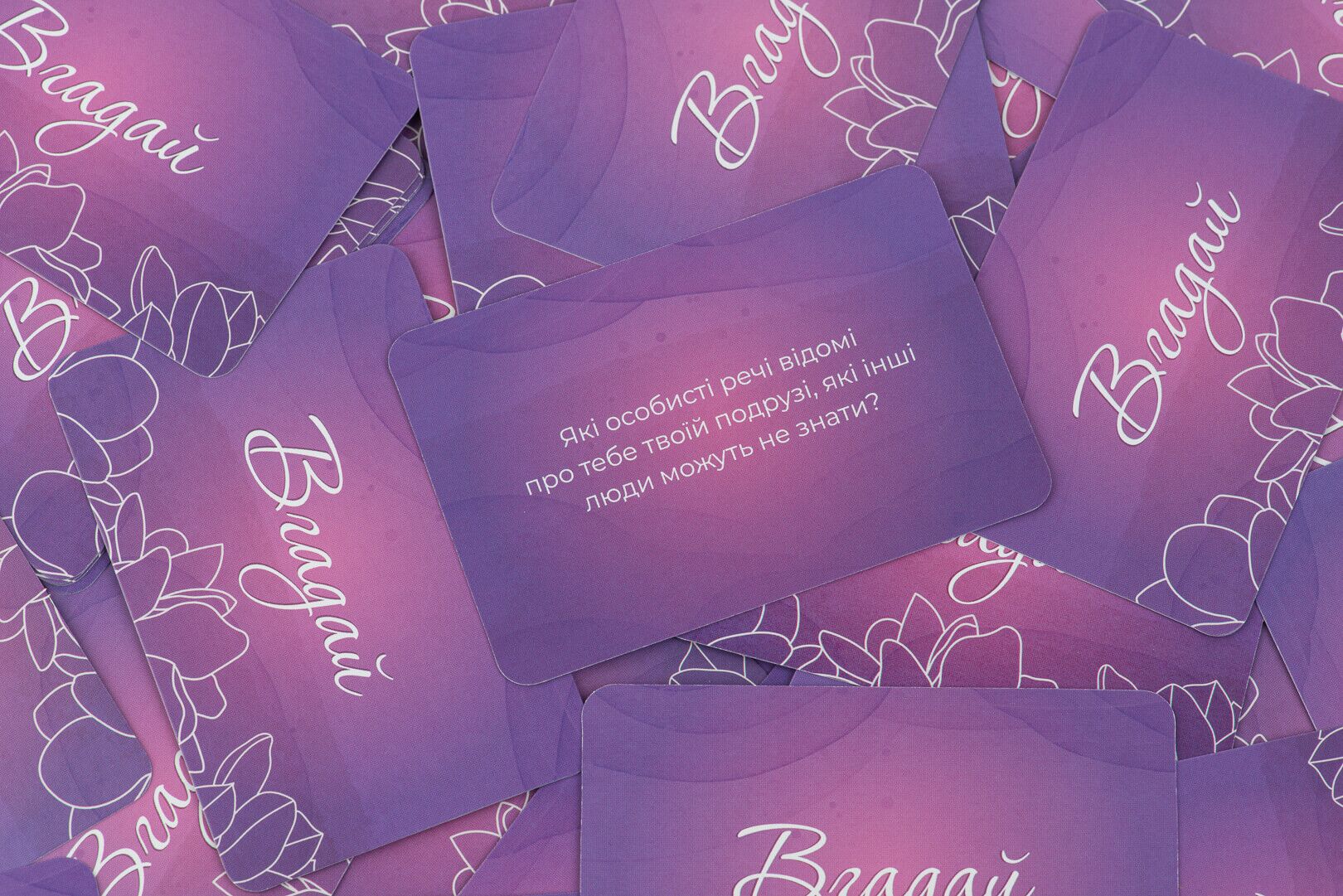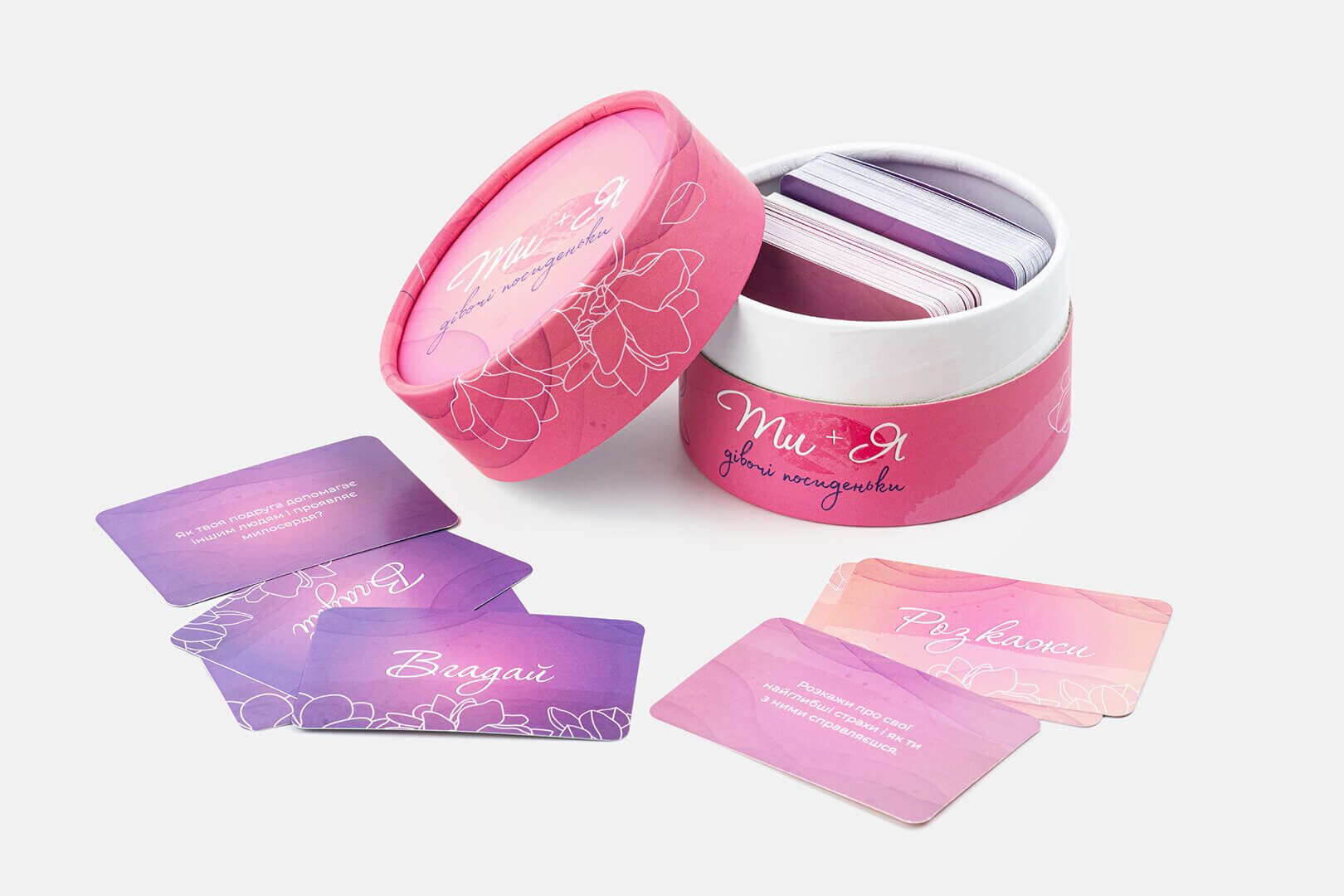 Опис: «ТИ + Я: Дівочі посиденьки» — гра, що розкриє нові грані кожної із дівчат та додасть емоційності вашим зустрічам! Доповніть ваші посиденьки цікавими та важливими темами, теплими спогадами та відвертими розмовами. Ваші зустрічі стануть ще більш наповненими з нашою грою!