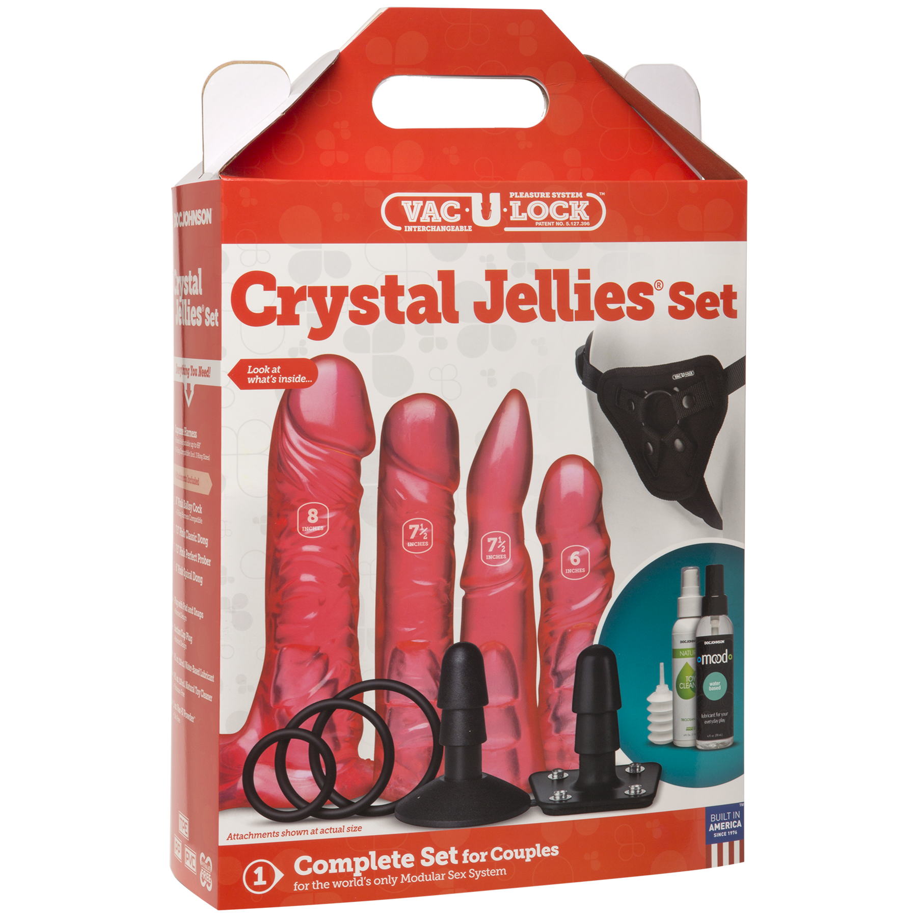 Crystal Jellies Set від Doc Johnson – це відмінний набір, який підійде як для новачків, так і для досвідчених користувачів. У наборі Ви знайдете 4 фалоімітатори різних розмірів, 2 кріплення на присосці і засувках, регульовані трусики, 3 змінних кільця і засоби по догляду за іграшками.