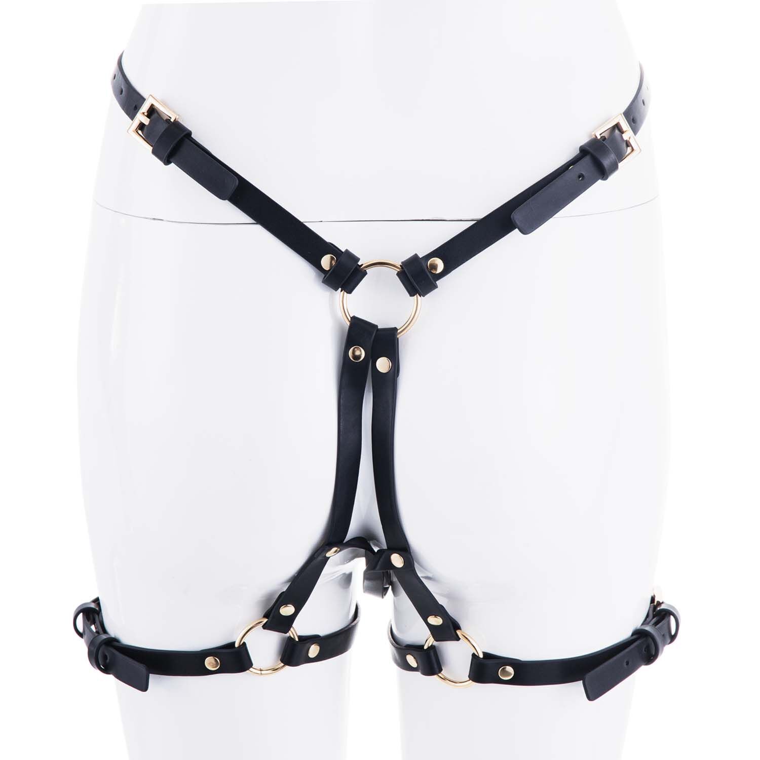 Модель виконана з високоякісної вичиненої шкіри чорного кольору. До трикутної передньої панелі заклепками прикріплено металеве кільце для фіксації фалоімітатора. На тілі цей «трикутник насолоди» тримається за допомогою ременів, обвитих навколо талії. На попереку вони з’єднані металевим кільцем, від якого відходять кріплення для ніг. Підігнати ремені по фігурі можна відразу в декількох місцях: на поясі, на ногах, а також у зоні лобка. Щоб скоригувати посадку, достатньо затягнути або послабити пряжки.